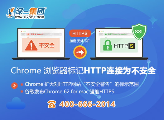 [深一SSL證書]HTTPS加密無處不在,谷歌Chronme瀏覽器2017年7月起標記HTTP連接為不安全,SSL證書是您避不開的安全保障。詳細報價咨詢深一商務!